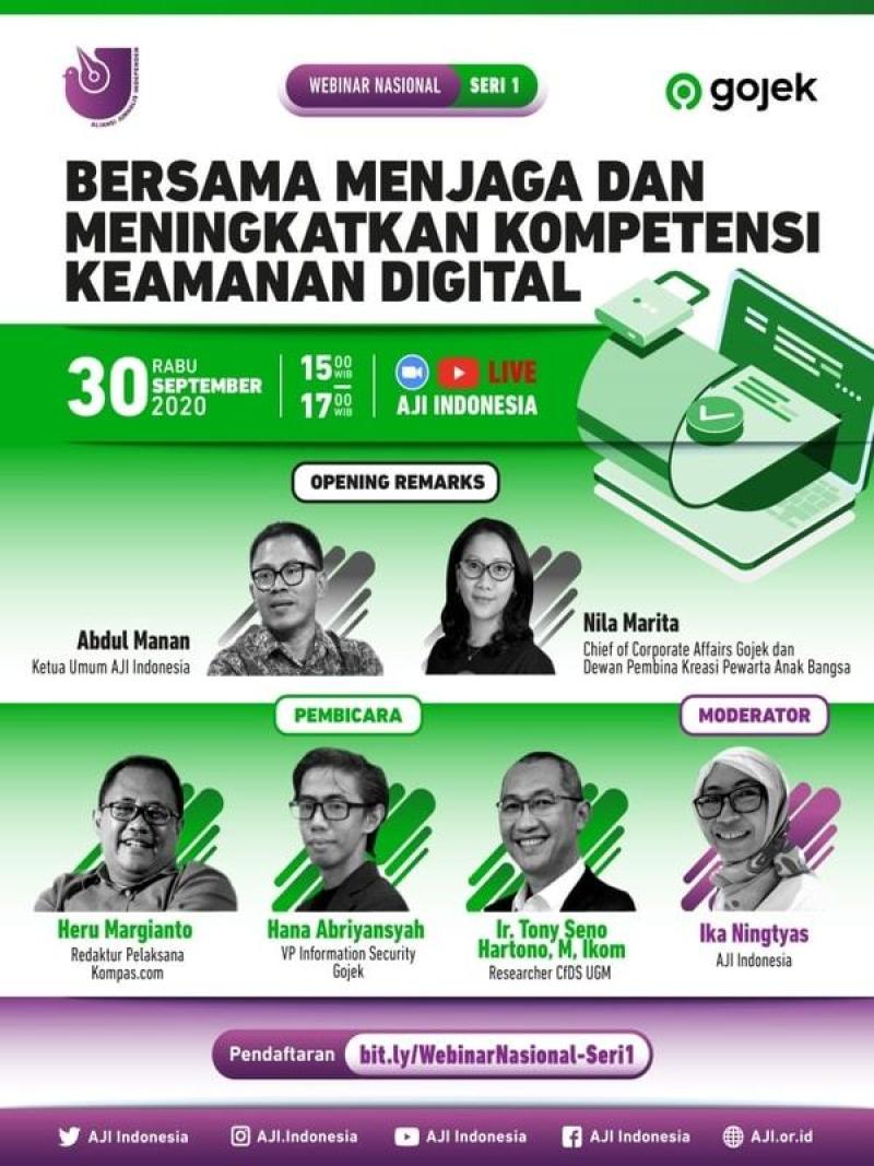AJI Indonesia bekerjasama dengan Gojek mengadakan Serial Webinar Nasional #1 dengan tema “Bersama Menjaga dan Meningkatkan Kompetensi Keamanan Digital” yang akan diselenggarakan pada :