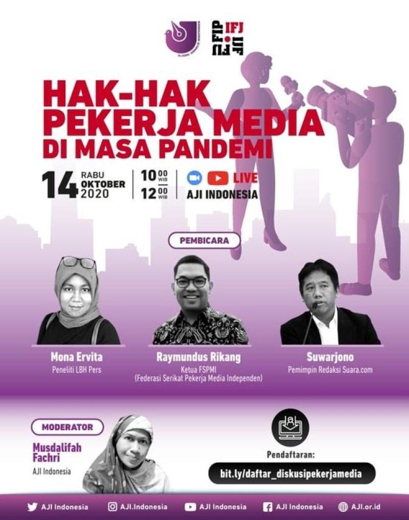 AJI Indonesia bekerjasama dengan IFJ mengundangmu mengikuti Diskusi Hak-hak Pekerja Media di Masa Pandemi yang diselenggarakan pada: