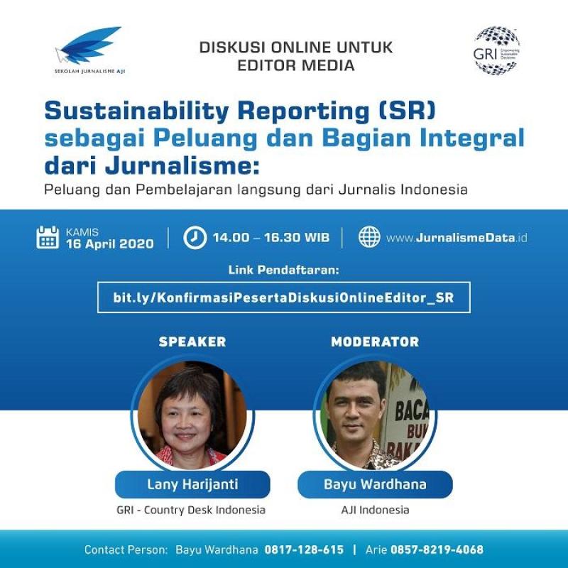 Terkait hal di atas, maka Sekolah Jurnalisme Aliansi Jurnalis Independen (SJAJI) dan Global Reporting Initiative (GRI) akan menyelenggarakan Diskusi Online untuk Editor Media dengan tema Sustainability Reporting (SR) Sebagai Peluang dan Bagian Integral dari Jurnalisme: Peluang dan Pembelajaran langsung dari Jurnalis Indonesia”, tujuannya untuk memaparkan praktik dan pengalaman lapangan terkait bagaimana perusahaan membuat sustainability reporting yang sesuai dengan aturan POJK dan standar internasional, The GRI Standards, dan menampilkan cerita dan pengalaman sukses dari media dalam memanfaatkan sustainability report dalam pemberitaan dan bentuk karya jurnalistik lain.