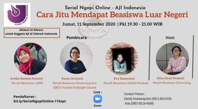 Bidang Pendidikan AJI Indonesia mengundang rekan-rekan Anggota AJI di Seluruh Indonesia untuk mengikuti Serial Ngopi Online, dengan tema “Cara Jitu Mendapat Beasiswa Luar Negeri”, yang akan diselenggarakan pada :