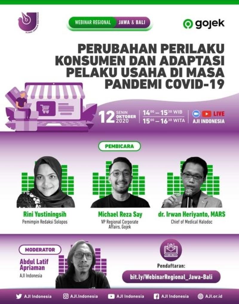Untuk mengetahui bagaimana perubahan perilaku konsumen di masa pandemi, adaptasi pelaku usaha (khususnya platform digital) terhadap perubahan perilaku konsumen saat ini serta peran media dalam meningkatkan kesadaran masyarakat tentang pentingnya mengedepankan protokol kesehatan dalam keseharian, AJI Indonesia dan Gojek kembali mengadakan Serial Webinar Regional Seri 2 wilayah Jawa – Bali bertema "Perubahan Perilaku Konsumen dan Adaptasi Pelaku Usaha di Masa Pandemi COVID-19" yang akan diselenggarakan pada: