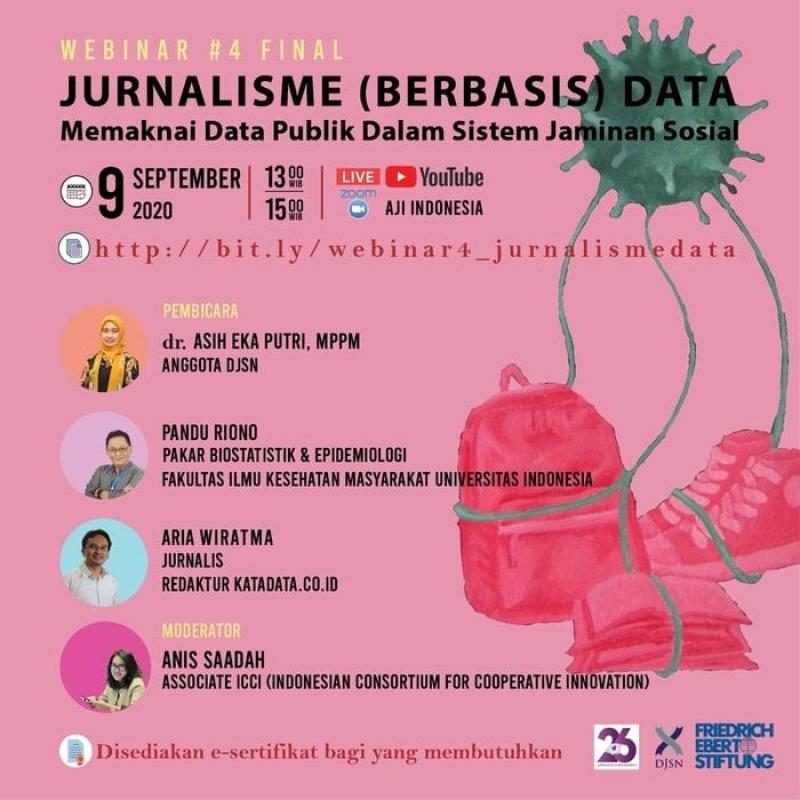 AJI Indonesia bekerjasama dengan Dewan Jaminan Sosial Nasional (DJSN) dan Friedrich Ebert Stiftung (FES) mengundangmu mengikuti webinar #4 “Jurnalisme (Berbasis) Data: "Memaknai Data Publik dalam Sistem Jaminan Sosial" yang diselenggarakan pada: