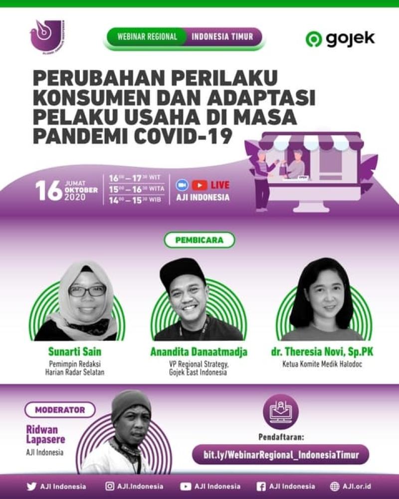 Untuk mengetahui bagaimana perubahan perilaku konsumen di masa pandemi, adaptasi pelaku usaha (khususnya platform digital) terhadap perubahan perilaku konsumen saat ini serta peran media dalam meningkatkan kesadaran masyarakat tentang pentingnya mengedepankan protokol kesehatan dalam keseharian, AJI Indonesia dan Gojek kembali mengadakan Serial Webinar Regional Seri 3 wilayah Indonesia Timur  bertema  "Perubahan Perilaku Konsumen dan Adaptasi Pelaku Usaha di Masa Pandemi COVID-19" yang akan diselenggarakan pada: