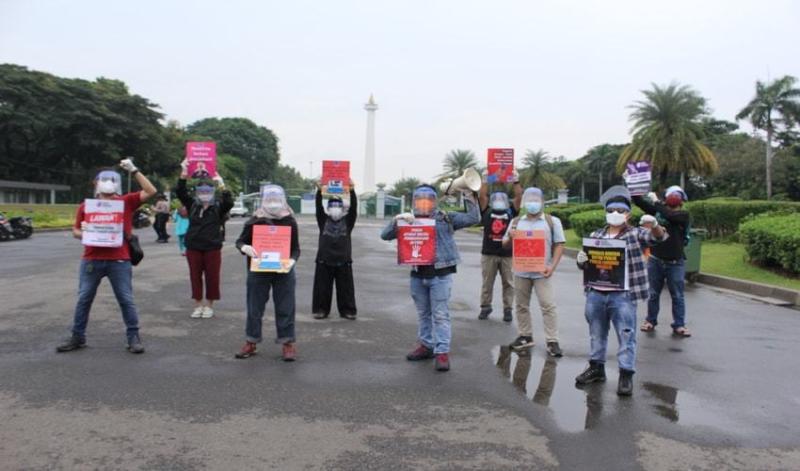 Jakarta - Aliansi Jurnalis Independen (AJI) Jakarta menggelar aksi solidaritas di Patung Kuda Arjuna Wiwaha, Jakarta Pusat pada Senin, 5 April 2021. Aksi damai dimulai pukul 10.00 WIB. Sebanyak 10 orang anggota AJI Jakarta melakukan aksi teatrikal. Mereka mendesak Presiden Joko Widodo dan Kapolri Jenderal Listyo Sigit Prabowo mengusut tuntas kasus penganiayaan yang dialami oleh jurnalis Tempo, Nurhadi di Surabaya. Peserta aksi membentangkan berbagai poster berisi kecaman atas kebrutalan pelaku kekerasan terhadap jurnalis Tempo tersebut.