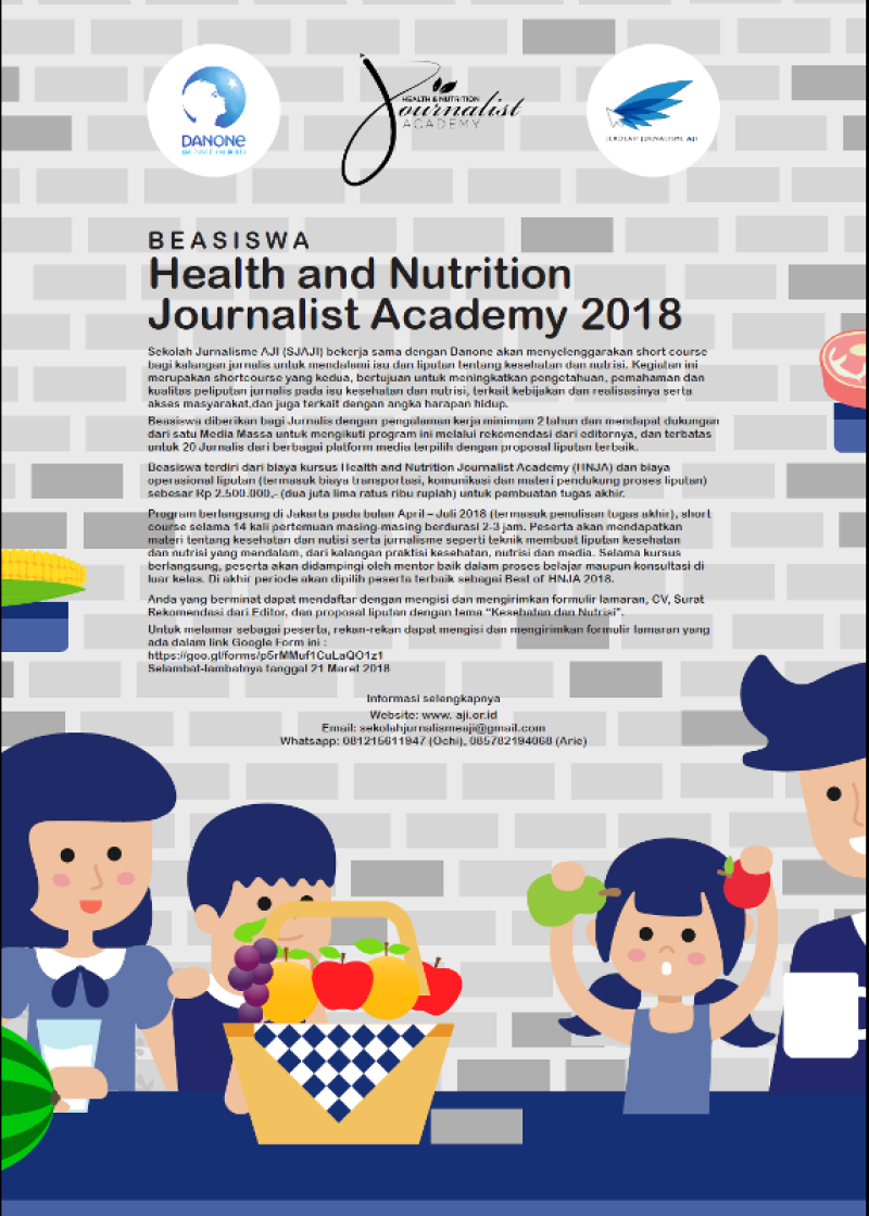 Anda yang berminat dapat mendaftar dengan mengisi dan mengirimkan formulir lamaran, CV, Surat Rekomendasi dari Editor, dan proposal liputan dengan tema Kesehatan dan Nutrisi”.