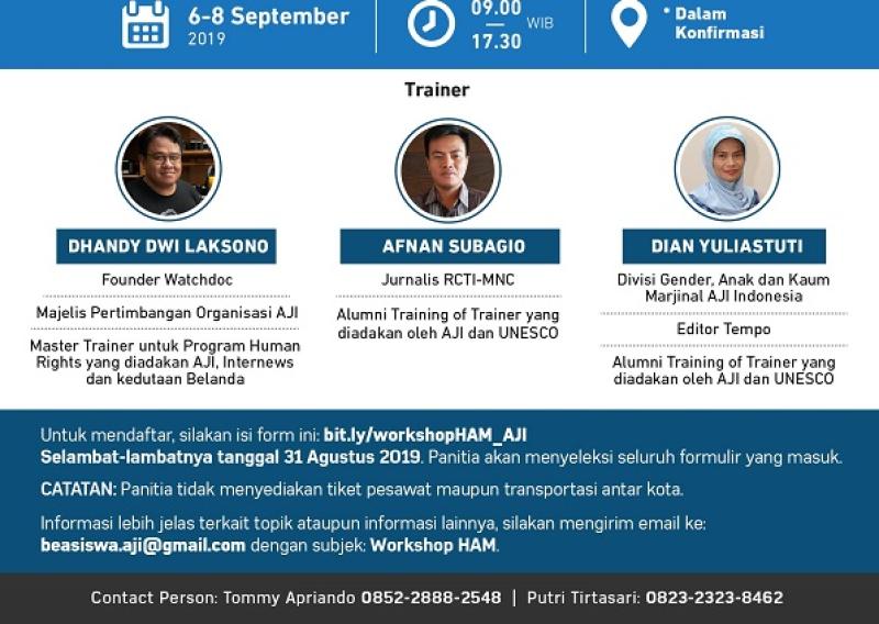 Informasi lebih jelas terkait topik ataupun informasi lainnya, silakan mengirim email ke: beasiswa.aji@gmail.com dengan subjek: Workshop HAM.