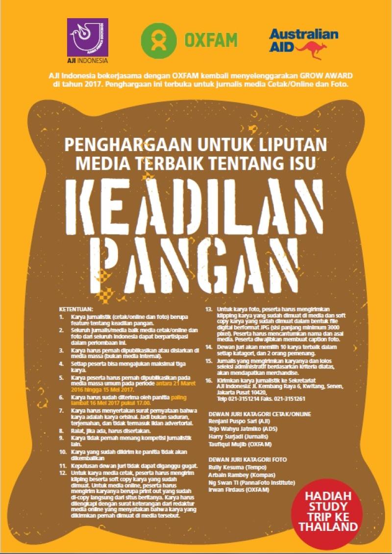 Aliansi Jurnalis Independen (AJI) - OXFAM memperpanjang penerimaan karya Penghargaan untuk Liputan Media Terbaik tentang isu Keadilan Pangan. Deadline penerimaan karya diperpanjang hingga 31 Mei 2017 pukul 17.00.