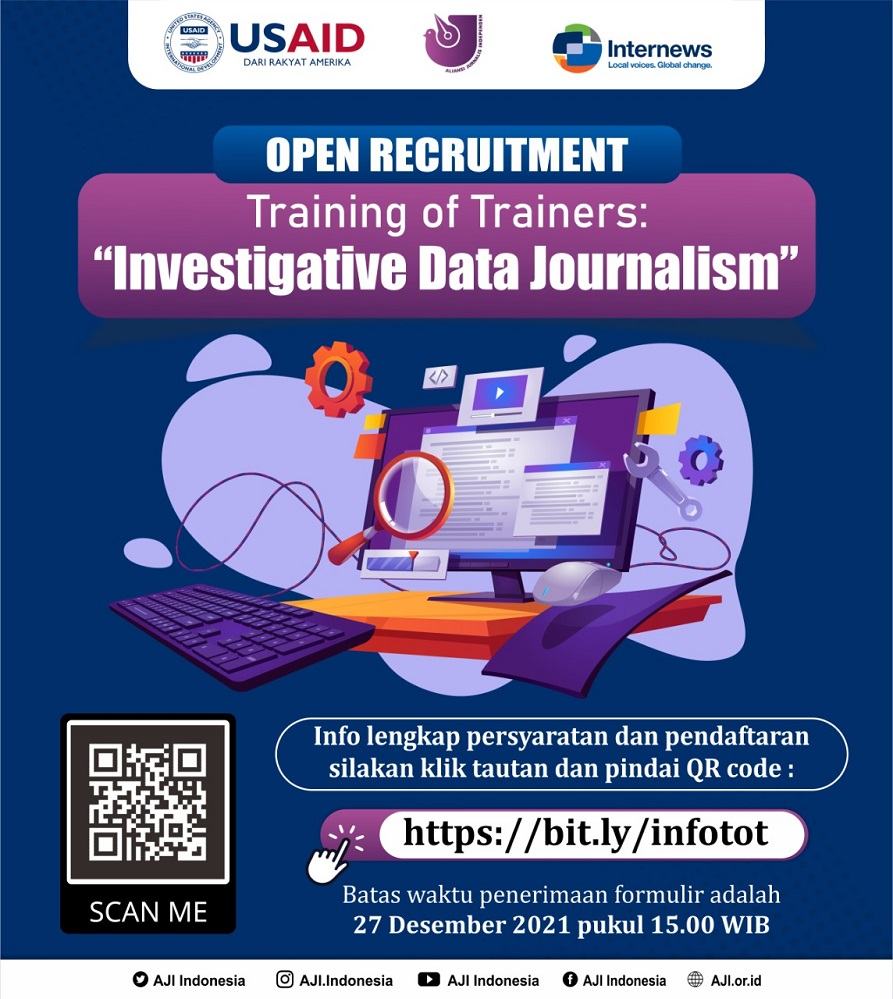 Aliansi Jurnalis Independen (AJI) Indonesia dengan dukungan USAID dan Internews, mengundang Anda untuk mengikuti program Training of Trainers: "Investigative Data Journalism”. Sebuah program peningkatan kapasitas jurnalis menggunakan kurikulum pelatihan investigasi dan jurnalisme data selama 80 jam yang terbuka untuk jurnalis di Indonesia untuk meningkatkan skill jurnalisme data dan investigasi. Peserta akan diberikan materi mengenai cara menemukan, mengumpulkan dan menganalisis data.