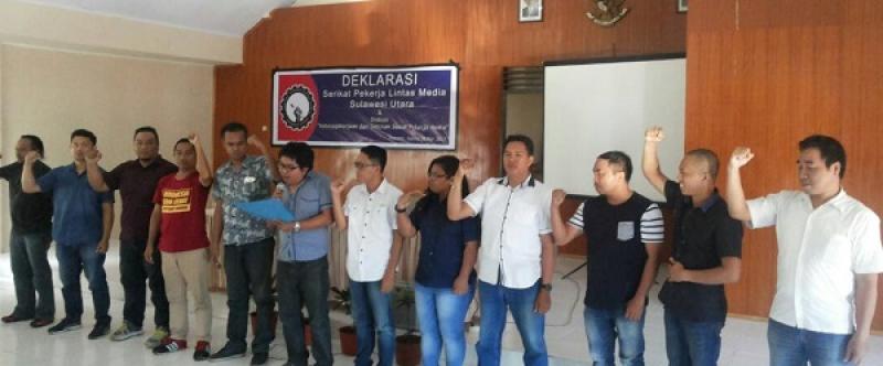 Manado -- Puluhan jurnalis yang bernaung di Aliansi Jurnalis Independen (AJI) Manado, mendeklarasikan berdirinya Serikat Pekerja Lintas Media (SPLM) di Sulawesi Utara. Deklarasi berlangsung di Aula Kantor Dinas Tenaga Kerja dan Transmigrasi Sulut, Jalan 17 Agustus Teling, Kecamatan Wanea, Kamis (18/5/2017).