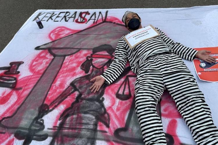 Jakarta- Aliansi Jurnalis Independen (AJI) Jakarta menggelar aksi solidaritas untuk jurnalis Tempo, Nurhadi yang menjadi korban kekerasan ketika meliput di Surabaya. Unjuk rasa berupa teatrikal dan