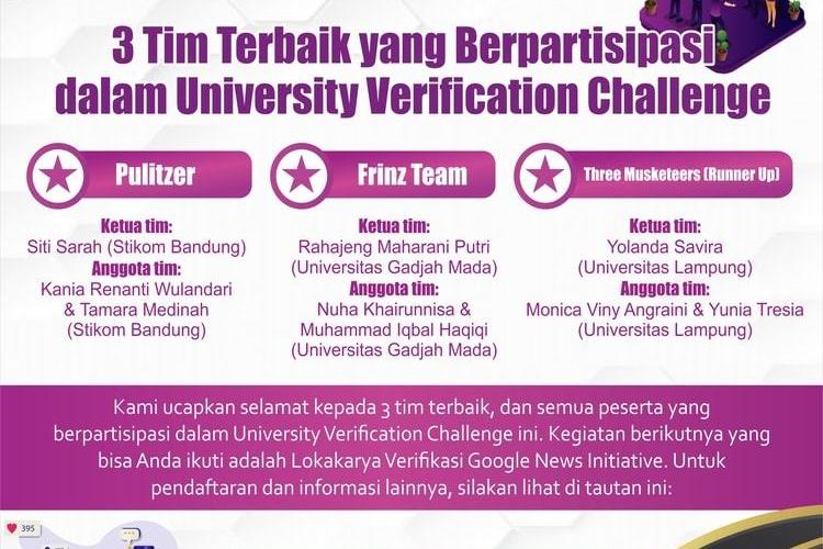 Google News Initiative (GNI) bekerja sama dengan Aliansi Jurnalis Independen (AJI) telah menyelenggarakan University Verification Challenge. University Verification Challenge adalah 6 serial kuis