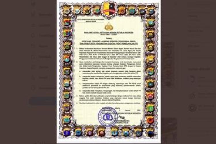 Kepala Kepolisian Negara Republik Indonesia mengeluarkan maklumat Nomor: Mak/1/I/2021 tentang Kepatuhan terhadap Larangan Kegiatan, Penggunaan Simbol dan Atribut Serta Penghentian Kegiatan Front