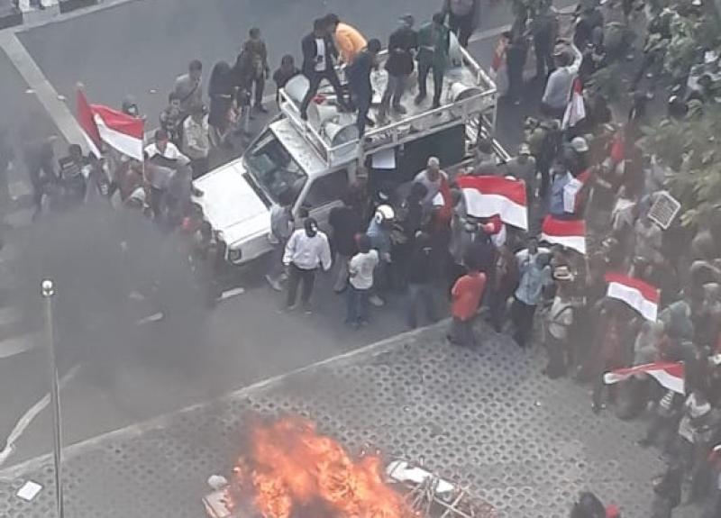 Aksi demonstrasi yang awalnya berjalan tertib itu tiba-tiba menjadi rusuh sekitar pukul 14.30 WIB. Puluhan massa aksi memaksa masuk menerobos halaman depan gedung KPK, lalu membakar sejumlah karangan bunga yang sebelumnya dikirimkan oleh aktivis antikorupsi dan wadah pegawai KPK. Mereka juga memaksa ingin mencopot kain hitam yang menutup simbol KPK.