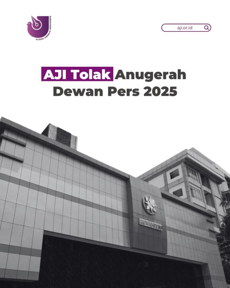 Aliansi Jurnalis Independen (AJI) menolak Anugerah Dewan Pers (ADP) 2025 yang akan diselenggarakan Dewan Pers pada Rabu 10 Desember 2025 di Balai Kota Jakarta. AJI menilai ADP tahun 2025 ini diselenggarakan dalam gelap, sembunyi-sembunyi, tidak transparan dan tidak melibatkan 11 lembaga konstituen Dewan Pers.