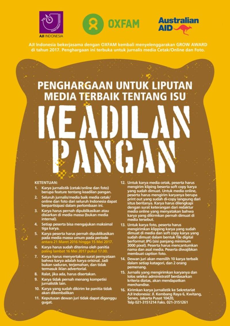 AJI Indonesia bekerjasama dengan OXFAM kembali menyelenggarakan GROW AWARD di tahun 2017. Ini merupakan Penghargaan untuk Liputan Media Terbaik tentang Isu Keadilan Pangan. Penghargaan ini terbuka untuk jurnalis media Cetak/Online dan Foto.