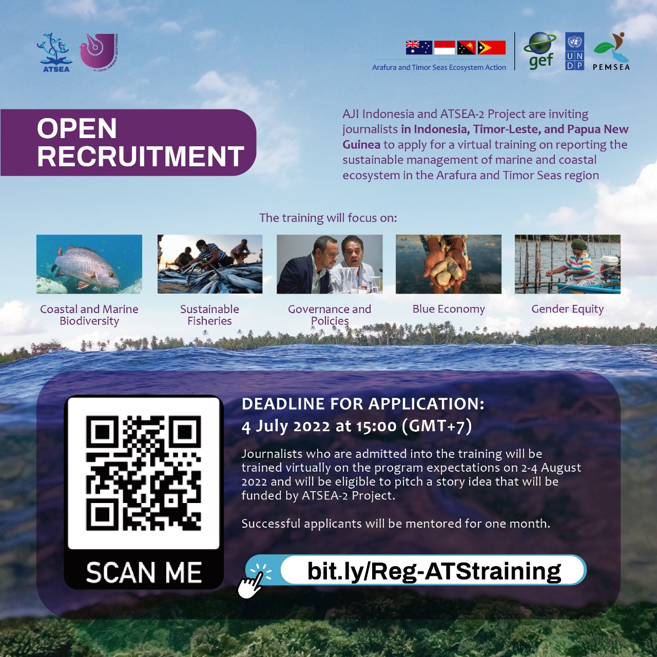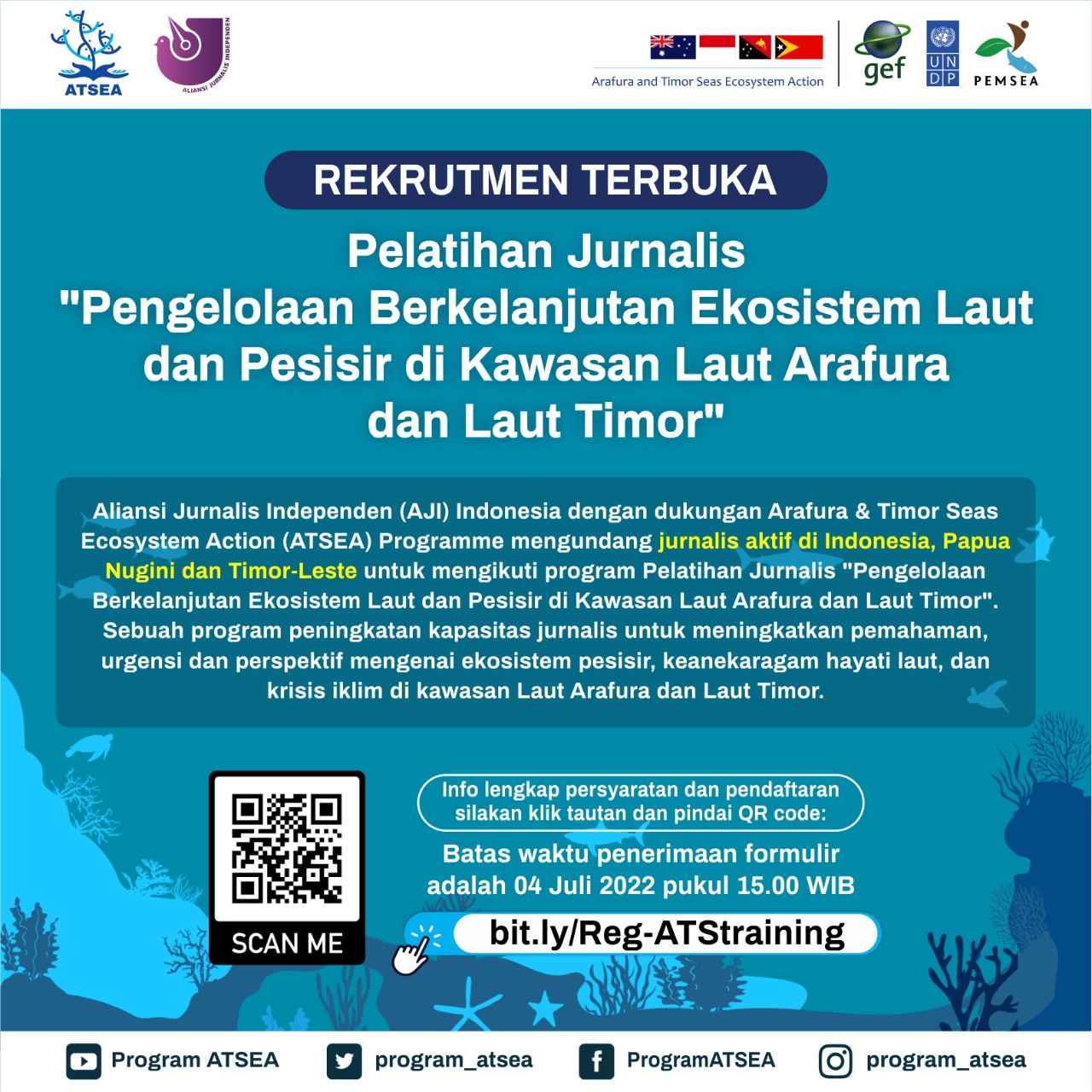 Aliansi Jurnalis Independen (AJI) Indonesia dengan dukungan Arafura & Timor Seas Ecosystem Action (ATSEA) Programme mengundang jurnalis aktif di Indonesia, Papua Nugini dan Timor Leste untuk mengikuti program Pelatihan Jurnalis "Pengelolaan Berkelanjutan Ekosistem Laut dan Pesisir di Kawasan Laut Arafura dan Laut Timor". Program ini dirancang untuk meningkatkan kapasitas jurnalis, meningkatkan pemahaman, rasa urgensi dan perspektif mereka tentang ekosistem pesisir, keanekaragaman hayati laut, dan krisis iklim di wilayah Arafura dan Laut Timor (ATS).