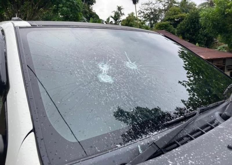 Kerusakan terjadi pada kaca depan mobil yang mengalami keretakan dan kaca mobil sebelah kiri hancur. Selain itu pintu depan dan belakang sebelah kiri dicoret-coret dengan cat pilox berwarna orange.