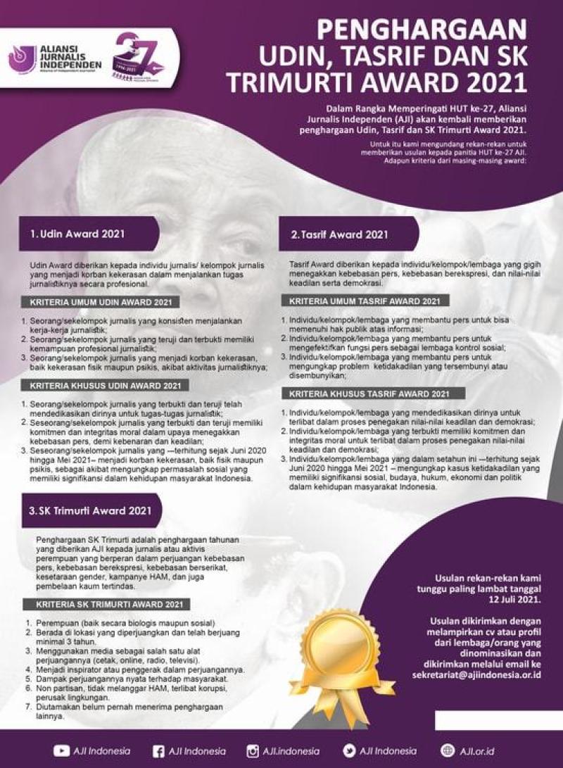 Dalam rangka HUT ke 27, AJI kembali memberikan Penghargaan Udin, Tasrif dan SK Trimurti Award 2021. Kirim usulan Anda sebelum 12 Juli 2021 by email ke sekretariat@ajiindonesia.or.id