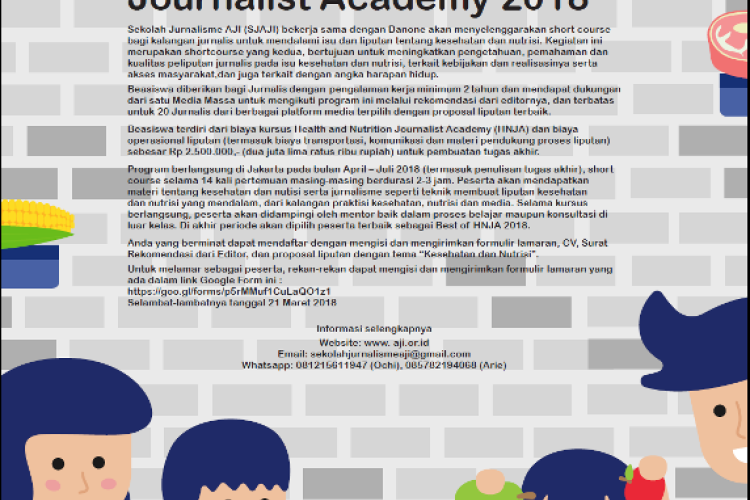 Pendaftaran Diperpanjang sampai dengan 13 April 2018 Sekolah Jurnalisme AJI (SJAJI) bekerja sama dengan Danone akan menyelenggarakan short course bagi kalangan jurnalis untuk mendalami isu dan liputan
