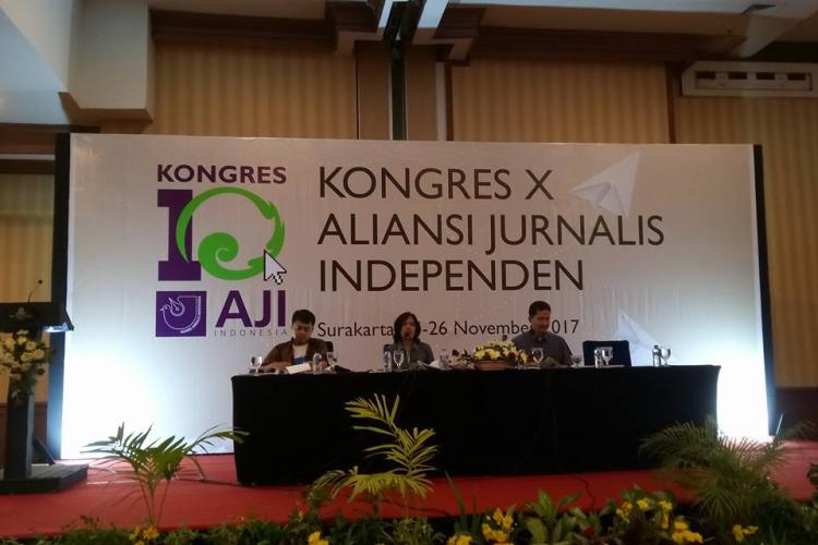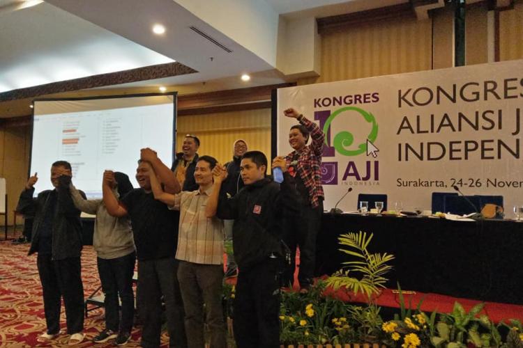 Solo - Abdul Manan dan Revolusi Riza terpilih secara aklamasi sebagai ketua umum dan sekretaris jenderal Aliansi Jurnalis Independen (AJI) dalam Kongres X di Hotel Sunan, Solo, 27 November 2017. Manan