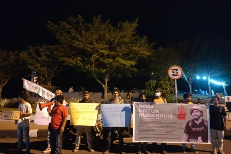 Ternate - Kawan Jurnalis Maluku Utara (KJMU) pada Rabu malam, 7 September 2022, melaksanakan aksi dukungan dan solidaritas untuk Nurkholis Lamaau, redaktur cermat.co.id yang mengalami tindakan