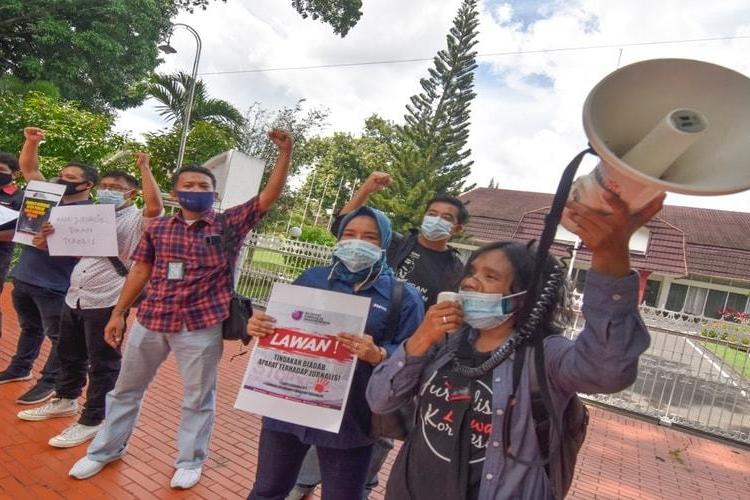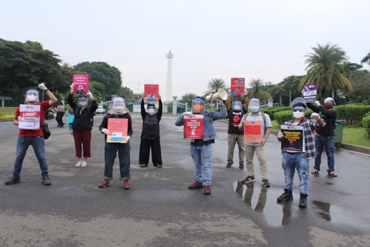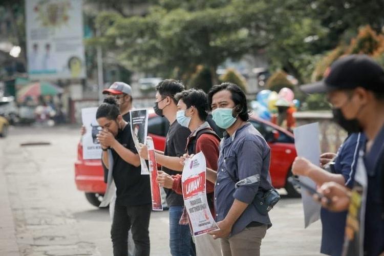 Jakarta - Aliansi Jurnalis Independen (AJI) Jakarta menggelar aksi solidaritas di Patung Kuda Arjuna Wiwaha, Jakarta Pusat pada Senin, 5 April 2021. Aksi damai dimulai pukul 10.00 WIB. Sebanyak 10