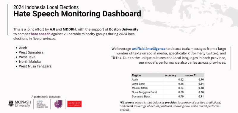 "Proyek pemantauan ini cukup rumit karena melibatkan kata kunci dalam berbagai bahasa daerah. Selain itu, setiap daerah juga memiliki konteks budaya mereka yang menjadi tantangan sehingga perlu kolaborasi dengan komunitas lokal, utamanya jurnalis lokal," jelas Associate Professor Data Science Monash University Indonesia, Derry Wijaya, yang juga memimpin tim peneliti.